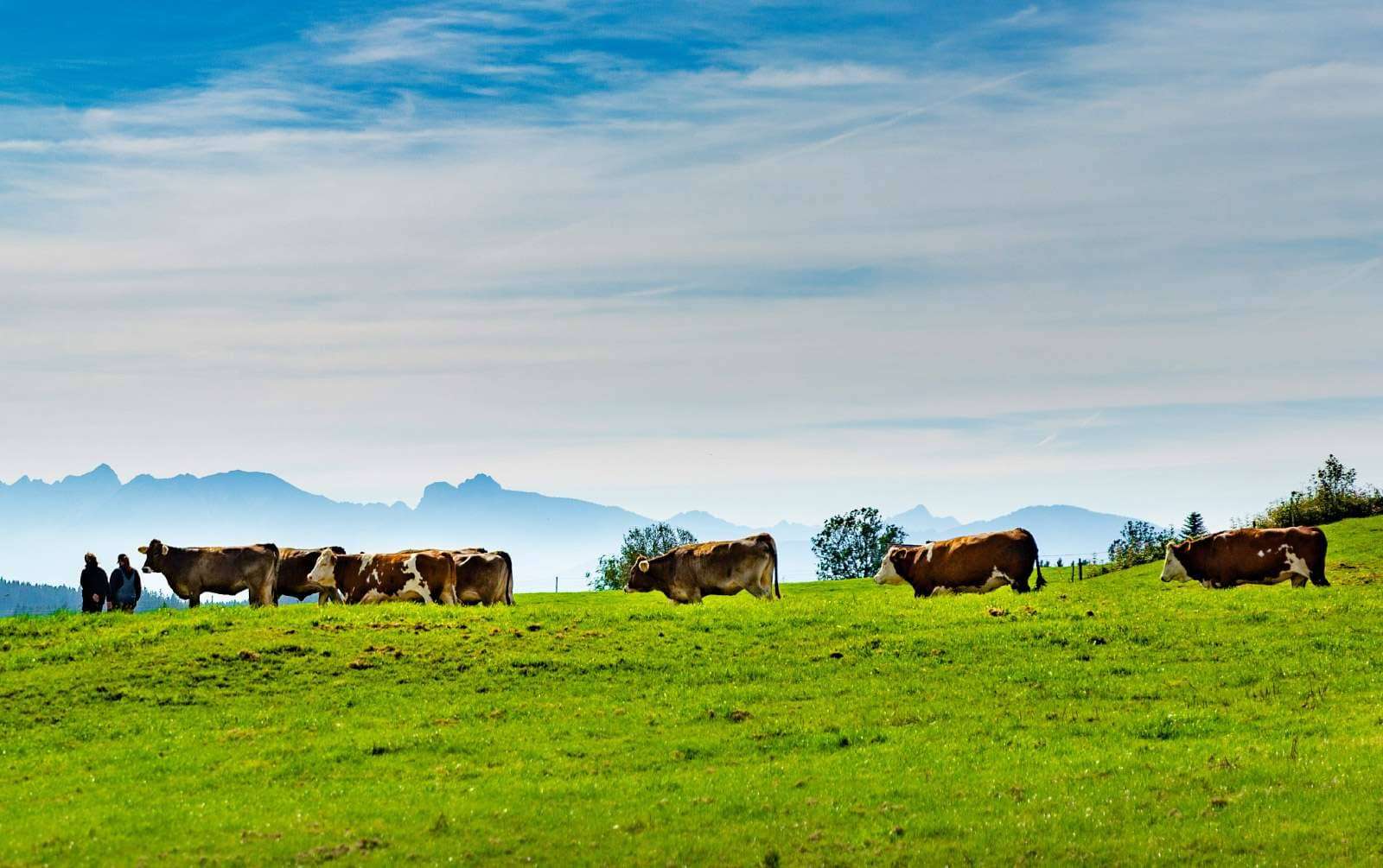 Our local Braunvieh cattle, a hardy and long-lived breed, have plenty of space to live healthy, happy lives in the meadows of the Allgäu. A fortunate side effect of their grazing is that they help to maintain the region’s cultural landscape.